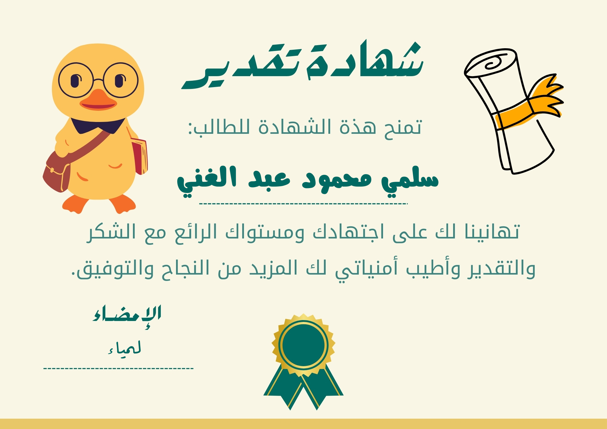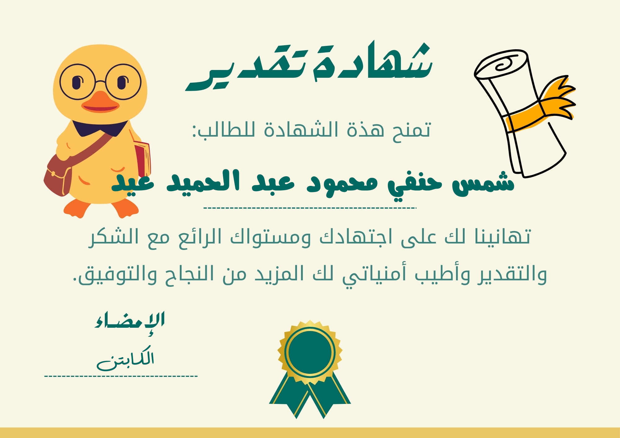 سوف يتم تصميم شهادة التقدير المطلوبة باسم التلميذ الذي تم إدخاله.