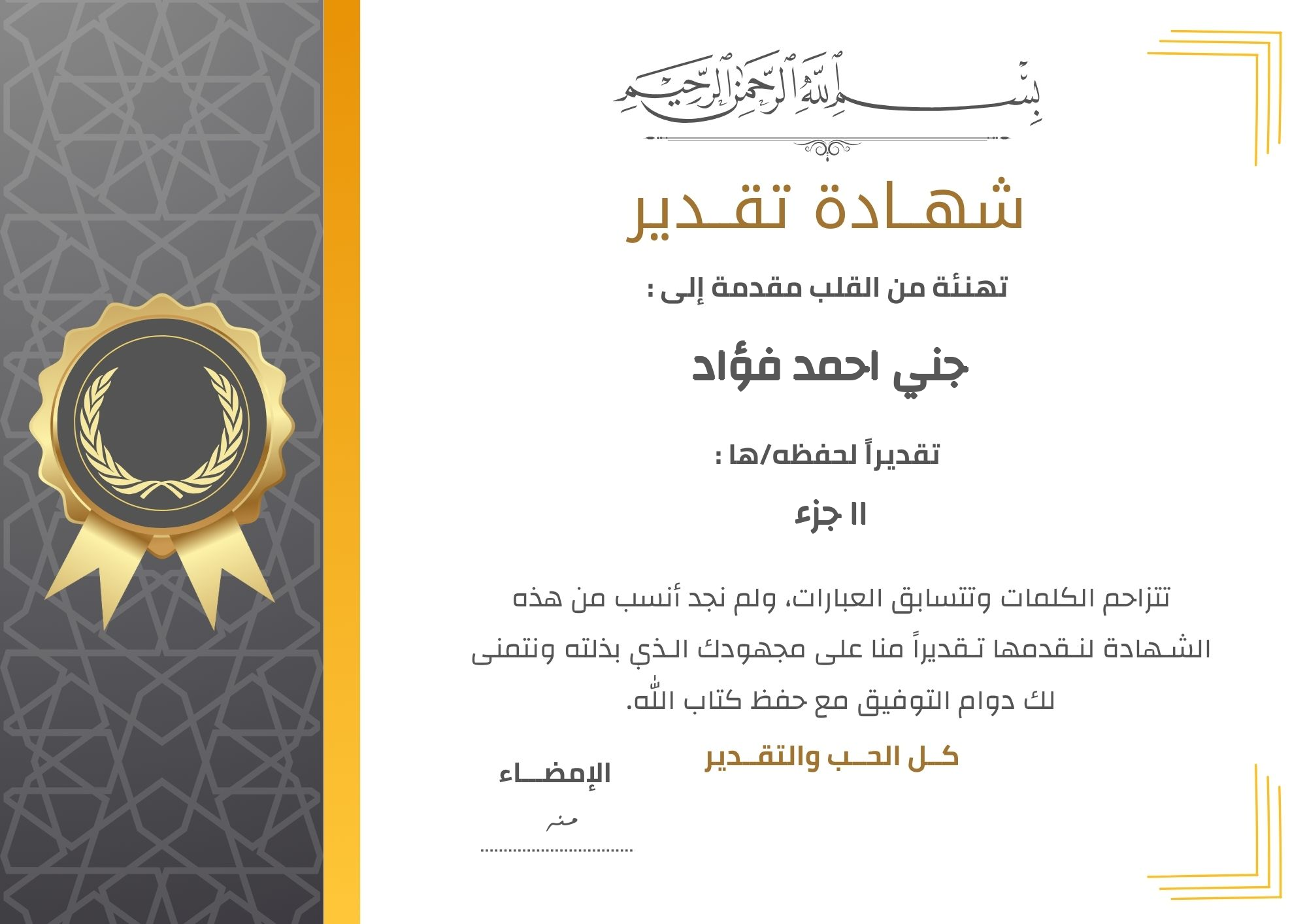 اكتب إمضاء كاتب الشهادة، مثلا اسم ولي الأمر الذي يهنئ ويكرم ابنه، أو اسم الشيخ المحفظ الذي يهنئ تلاميذه.