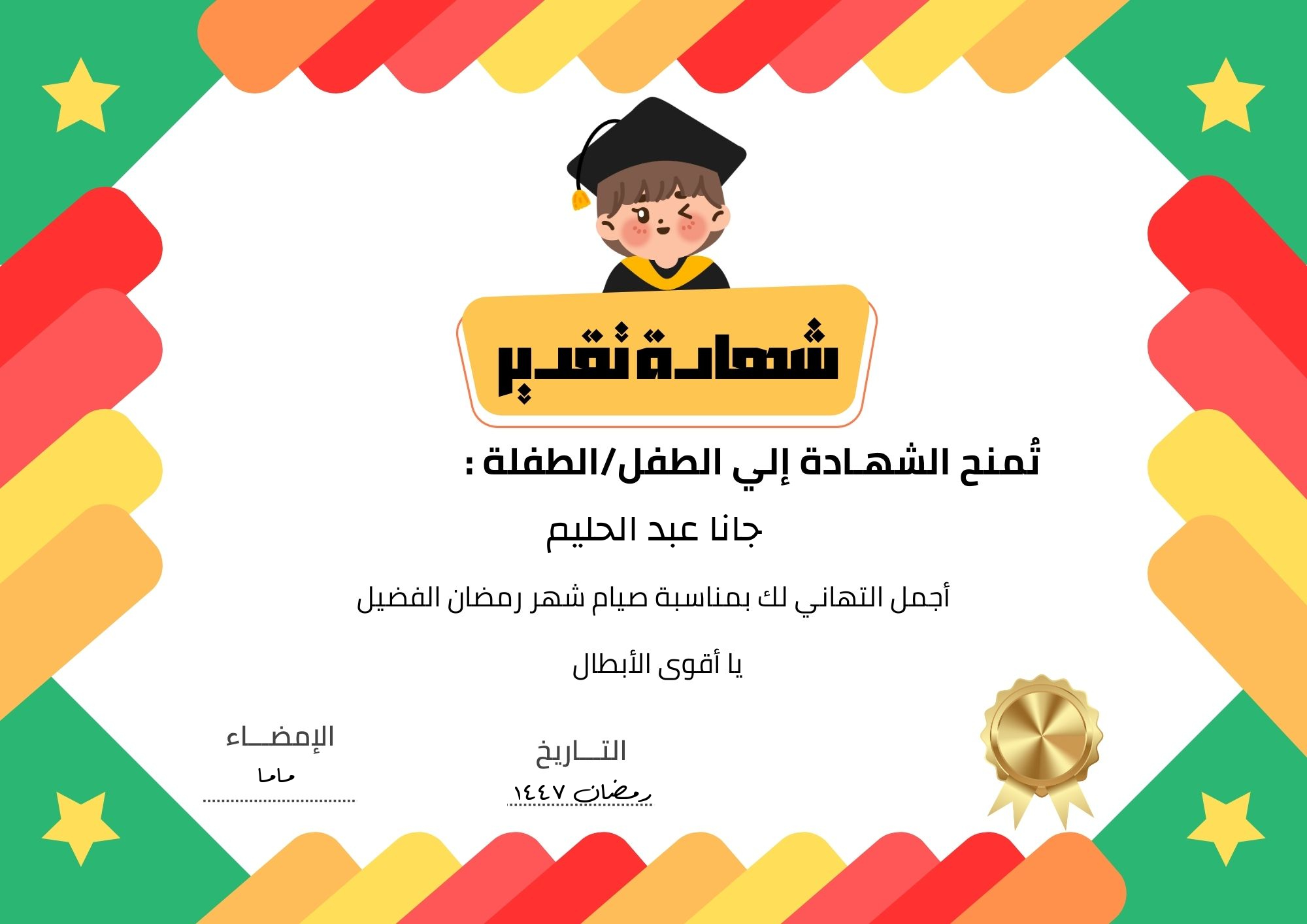 شهادة تقدير للأطفال بمناسبة صيام شهر رمضان