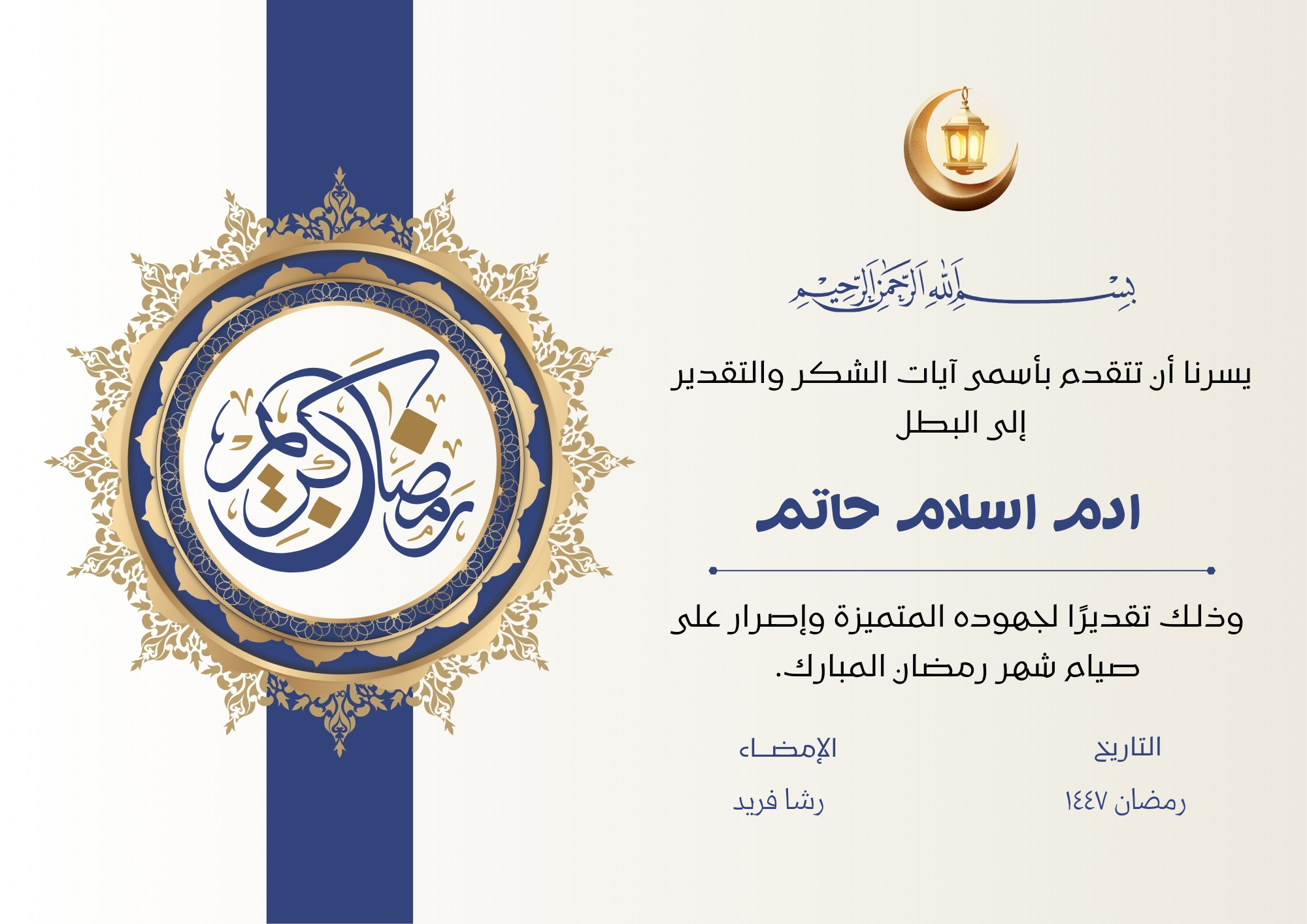 لإنشاء شهادة تقدير صيام رمضان 1447 باسم الطفل، اتبع الخطوات التالية: