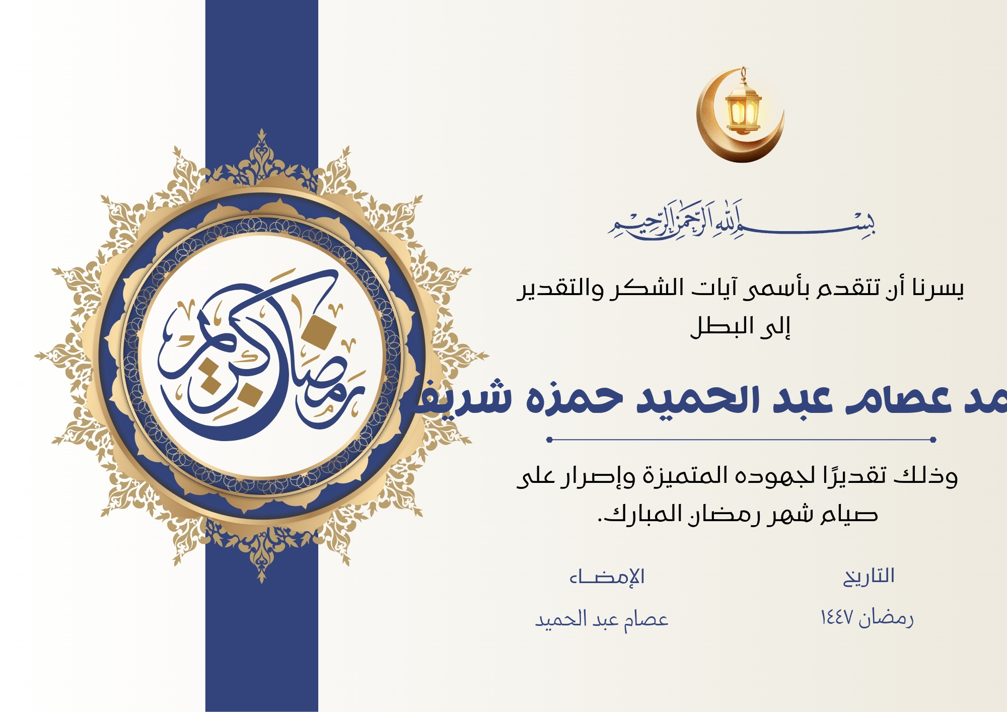 ابدأ الآن في إنشاء شهادة تقدير صيام رمضان 1447 لطفلك وامنحه لحظة فخر وذكرى جميلة في هذا الشهر المبارك.