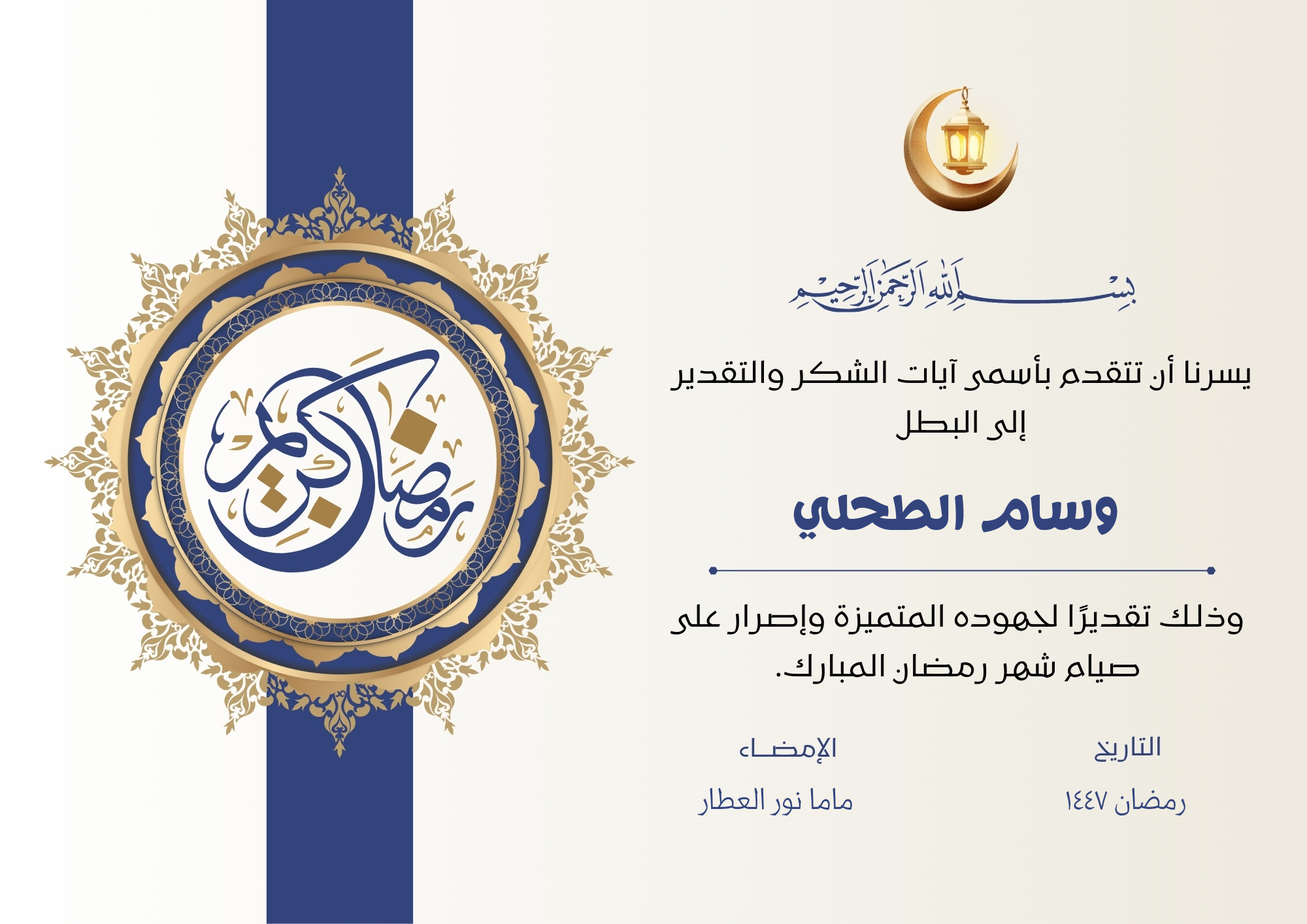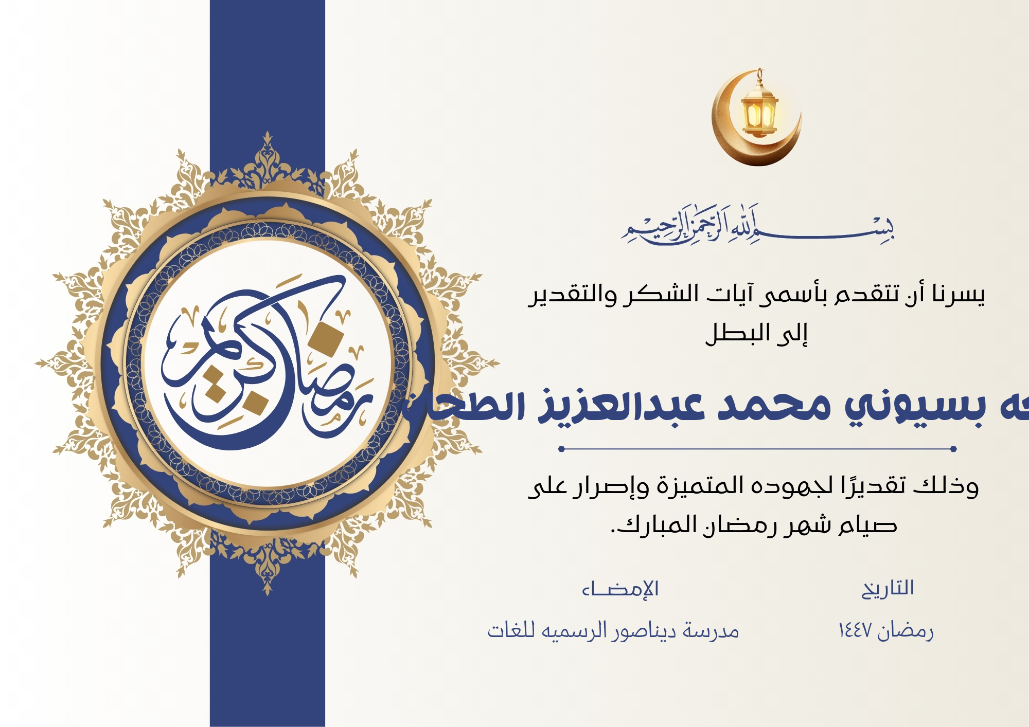 لإنشاء شهادة تقدير صيام رمضان 1447 باسم الطفل، اتبع الخطوات التالية: