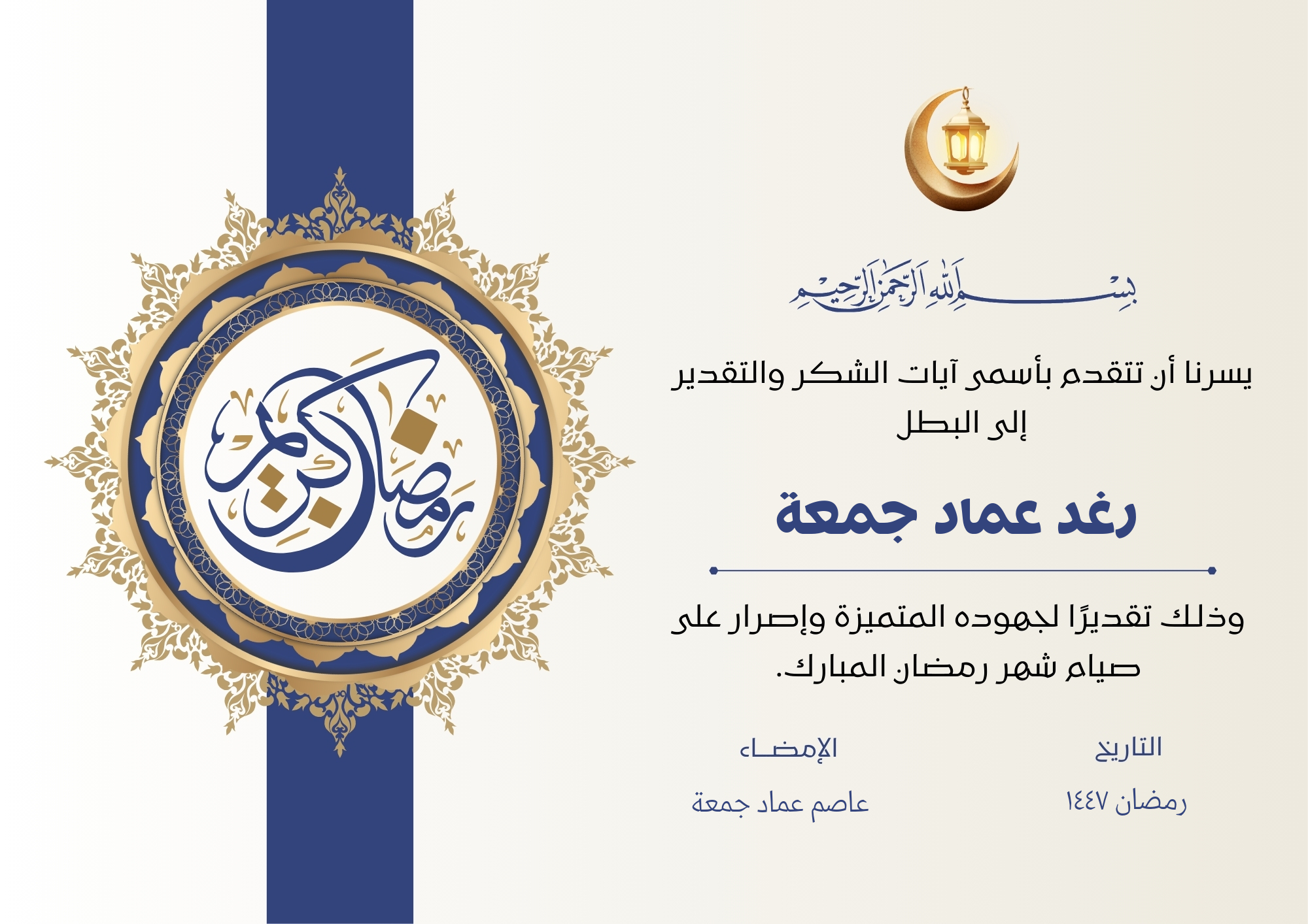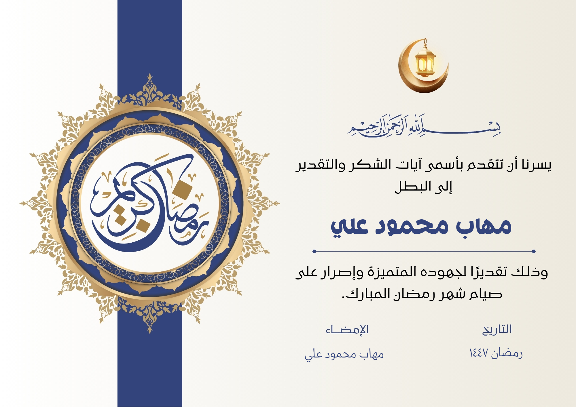 ابدأ الآن في إنشاء شهادة تقدير صيام رمضان 1447 لطفلك وامنحه لحظة فخر وذكرى جميلة في هذا الشهر المبارك.