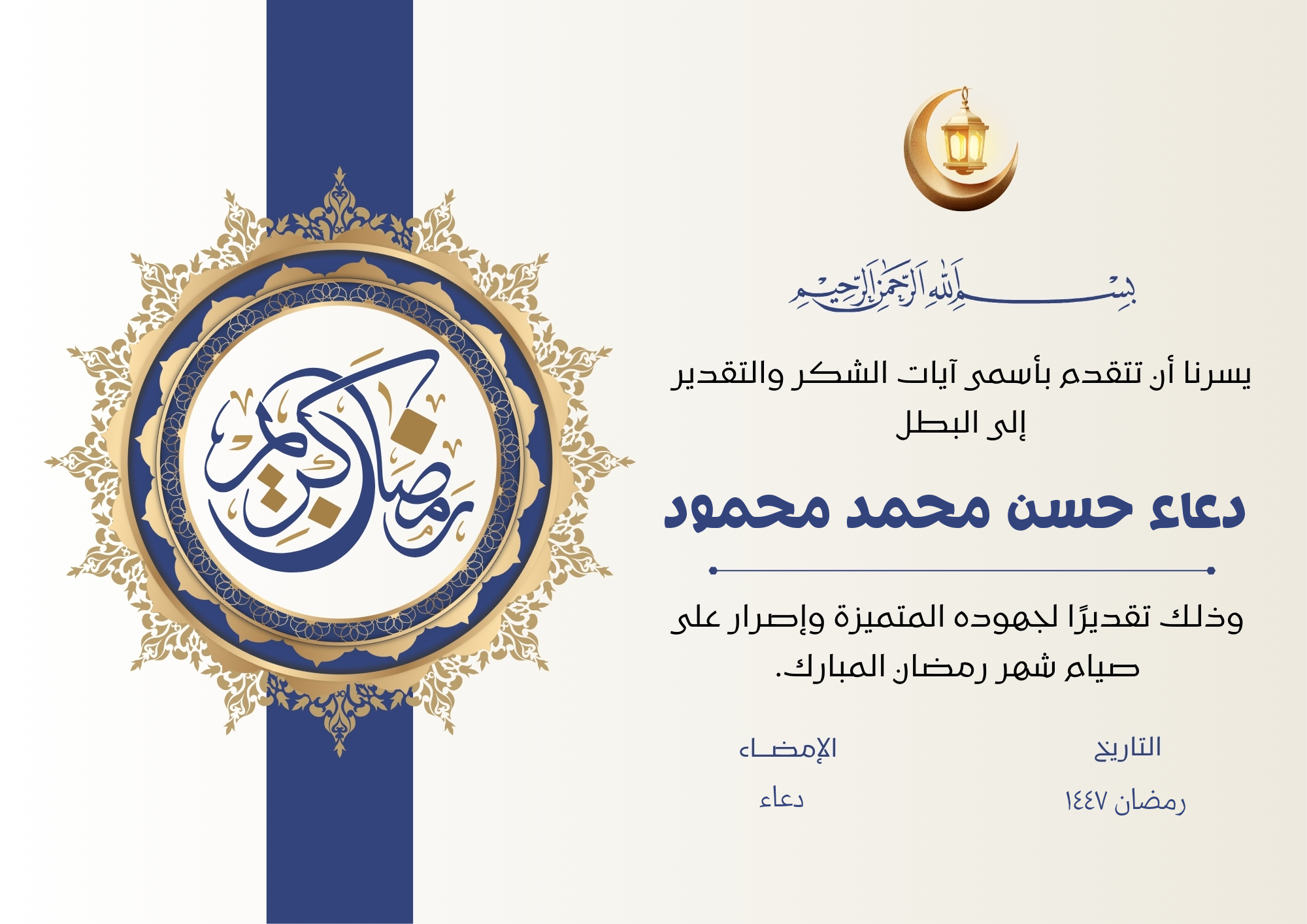 ابدأ الآن في إنشاء شهادة تقدير صيام رمضان 1447 لطفلك وامنحه لحظة فخر وذكرى جميلة في هذا الشهر المبارك.