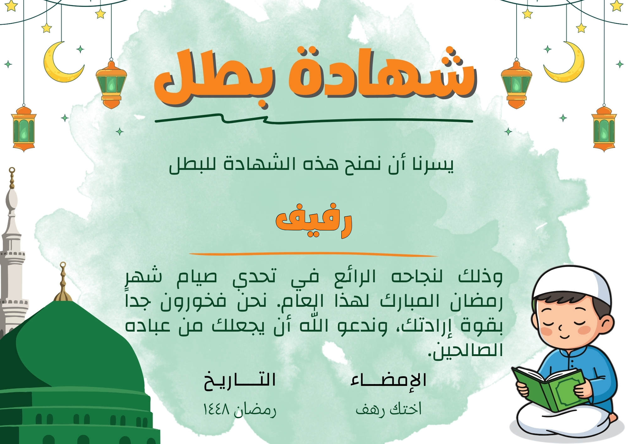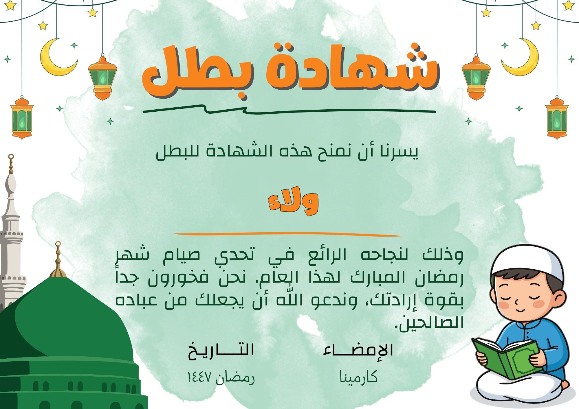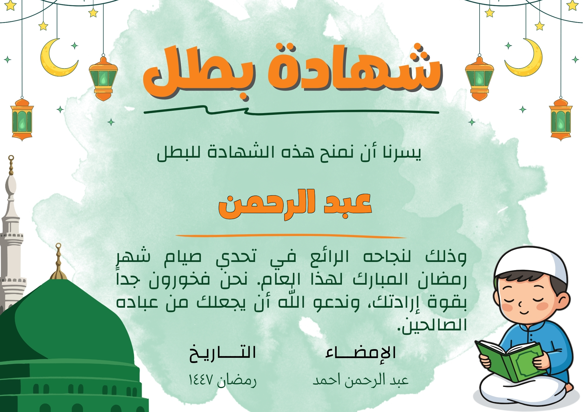 شهادة رمضان باسم مخصص مناسبة للاستخدام داخل المنزل، وفي المدارس، ودور التحفيظ، والأنشطة والمسابقات الرمضانية للأطفال. يمكنك طباعتها أو إرسالها إلكترونيًا بسهولة.